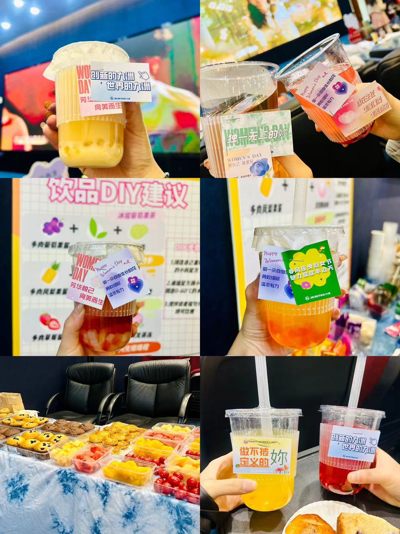 公司为大家准备了果酱、茶底、小料、水果等几十种丰富的饮品制作材料,大家对配料比例、调味选择、色彩搭配和外部包装等方面进行创意设计来调制饮品。不一会儿一杯杯色彩缤纷、果香四溢、造型各式的专属饮品制作完成,大家都沉浸在自己发挥想象、亲自动手制作饮品的幸福感和满足感中。