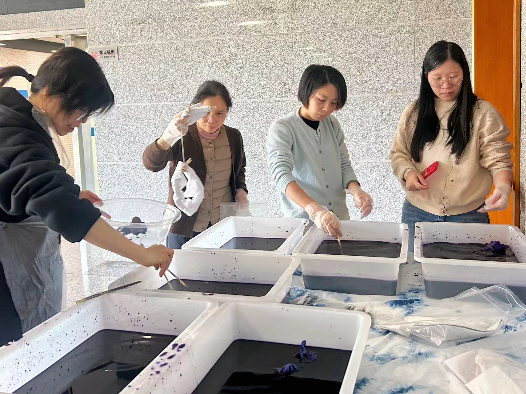 “巧手扎锦绣,靛蓝染繁花”,扎染活动进入正题,大家先对扎染的历史渊源、发展脉络、制造技艺有了深入了解,并通过一系列风格迥异的扎染艺术作品,激发了浓厚的创作热情。随后,大家通过夹扎法和捆扎法,发挥想象力和创造力,亲自设计、结扎并染色,制作出独具特色的扎染作品。