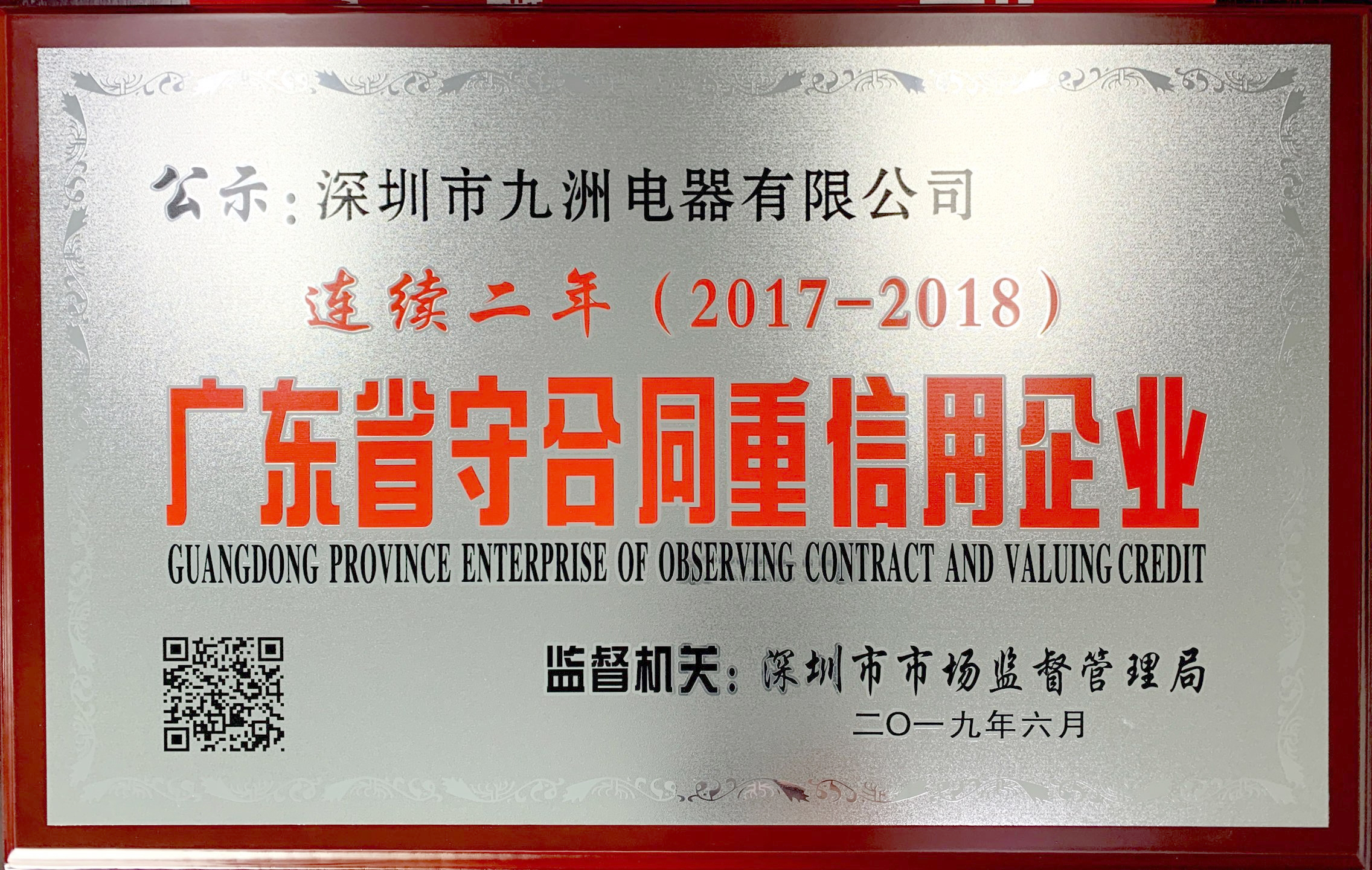 深圳九洲电器连续两年荣获 “广东省守合同重信用”荣誉称号