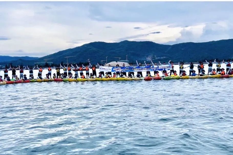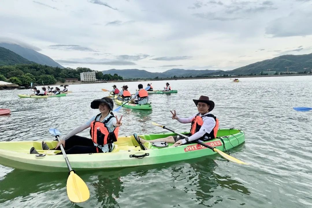 由专业的皮划艇教练为大家做皮划艇专业动作要领和安全注意事项的培训,大家认真聆听并迅速掌握要领。培训结束后,大家跃跃欲试,穿上救生衣,踏上皮划艇,撑起长船桨,自由练习,一阵阵欢声笑语和整齐的“左、右、左、右...”打破了海面的平静。