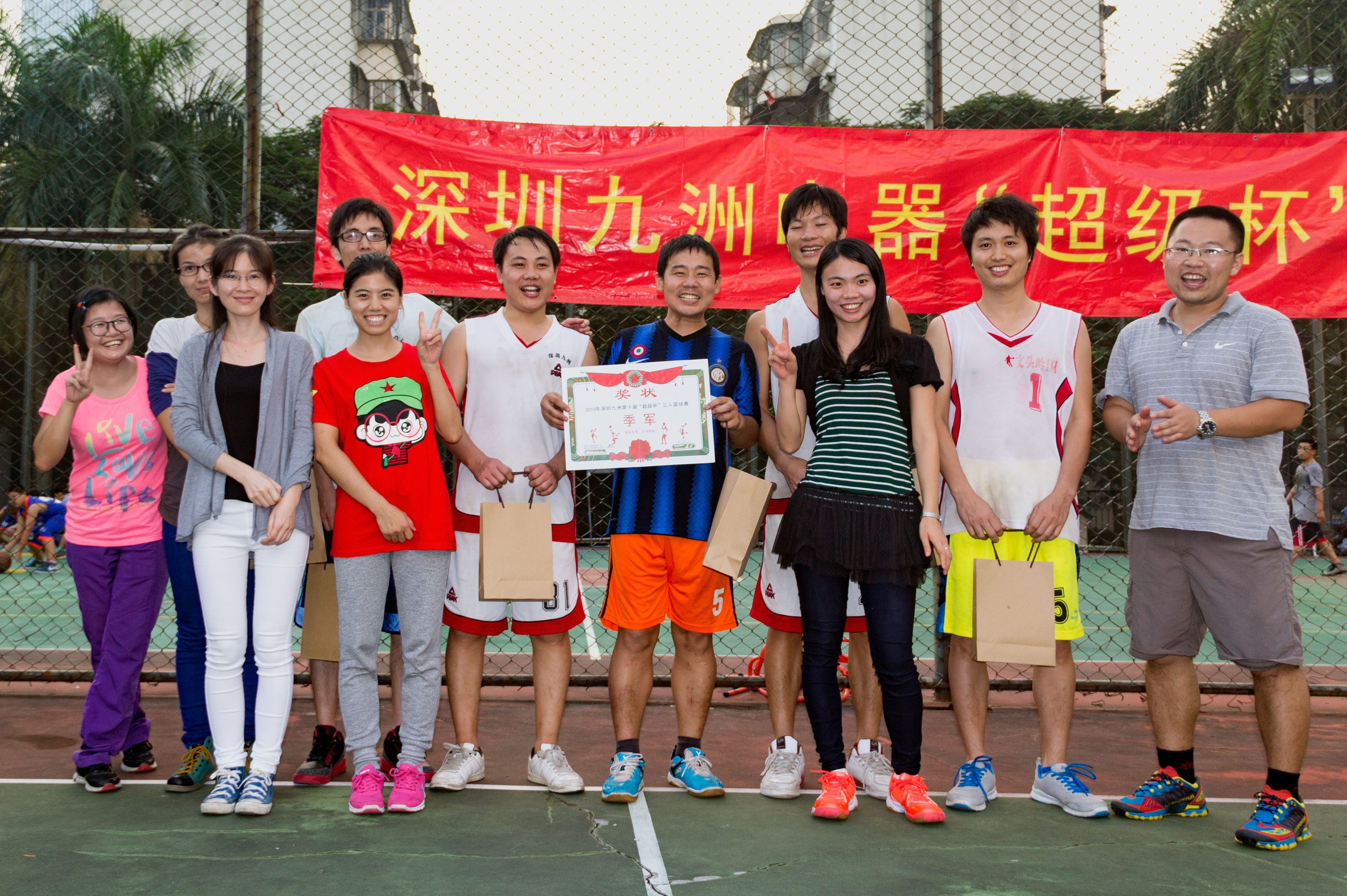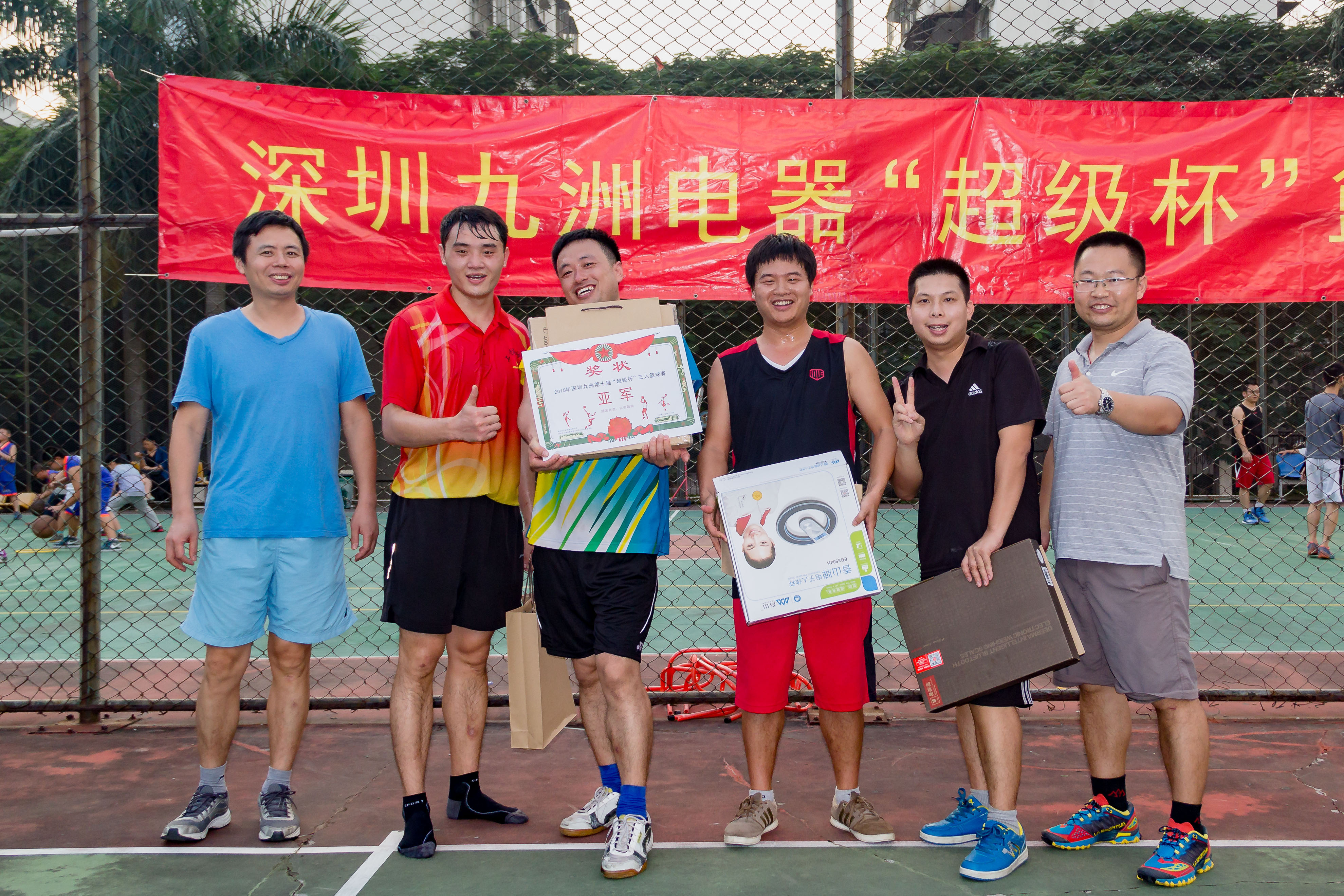 2015年11月14日,下午13时,深圳九洲第八届“超级杯”篮球赛随着一声哨响正式拉开战幕。 报名参加比赛有12支队伍,分为4个小组进行比赛淘汰制,运动员们在场下是亲密无间的同事,在球场上却是你争我赶,不放过任何一个得分的机会。欢呼声、喝彩声此起彼伏,经过3小时的艰苦鏖战,篮筐终结者凭借良好的团队配合和战术运用,最终获得冠军;亚军“技术支持部”、季军“515又浪”、3分球冠军程炳财,本届篮球赛圆满结束。