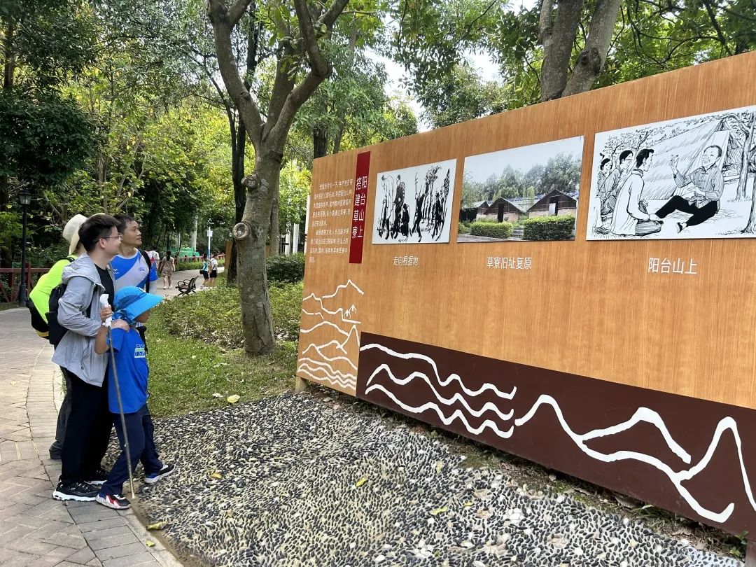 当日上午,全员集合完毕,大家伴着明媚的阳光,互相扶持,互相帮助,边走边感受绿色生态气息,赞叹革命先辈奋斗的不易,途径风门坳、大阳台山顶、秋菊亭,历时7小时,最终到达“胜利大营救”主题纪念碑前。